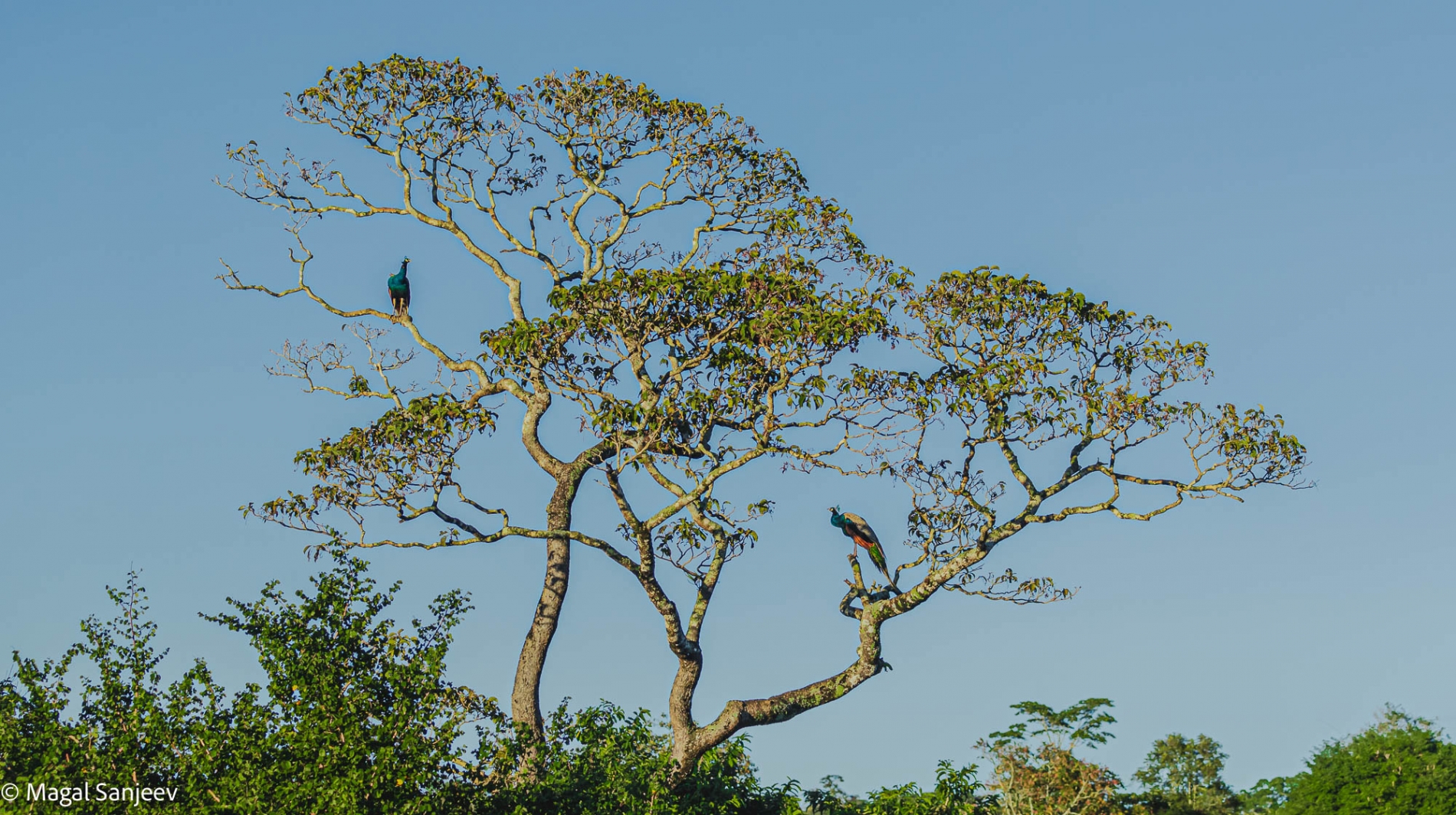 A beautiful morning when the sun was up, these two peacocks perched up on a tree, with winter setting in, leaves beginning to drop... Canon IDXMII with 70-200mm f2.8