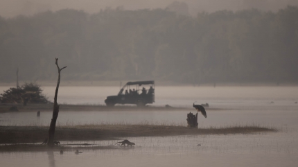 A foggy morning with light sneaking on, Kabini Backwaters - Indian National Bird being watched and admired by few enthusiasts, a fresh river otter stops by while I watch all three of them from a distance! Canon EOSR5 with 500mm f4, ISO 800, 1/6400, f4