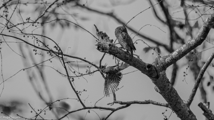 A tiny battle between tiny subjects - A Flame-back checks out on the Owlet and they continue to exchange few blows from time to time.