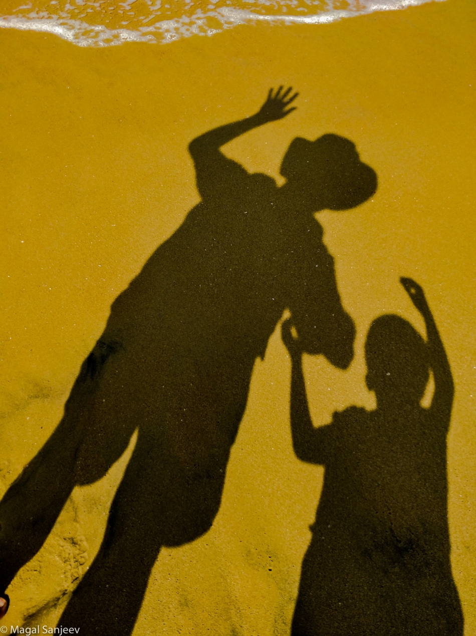 Emotions between a father and son! The son in this shadow, holding his father's hand, is so excited, even as the sea tides brush upon the shore! November 2018, Goa, India