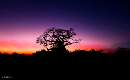 A Baobab stands silhouetted against the setting sun even as the angels of Twilight dances across. Ruaha 2024 Edition. Samsung Galaxy Ultra