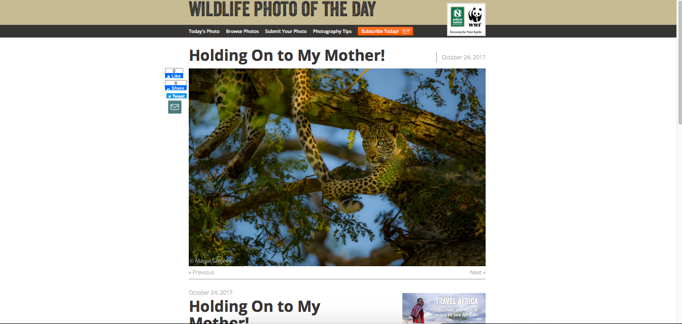 My Work featured in Wildlife Photo of the day titled " Holding on to my mother"; This cute little Leo Cub played with its mother tail while the mother kept an eye on for any potential prey. Mara 2017 Edition. Canon Gear.