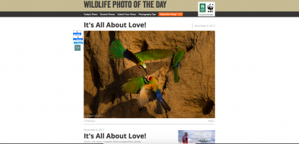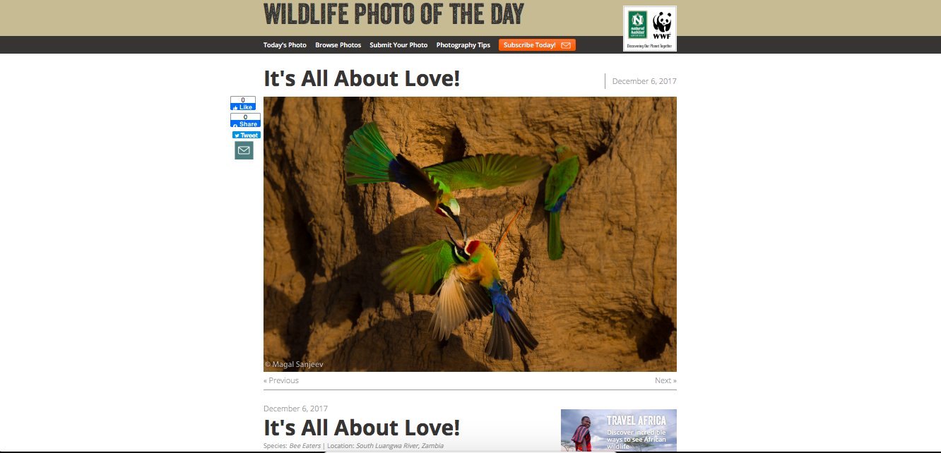 My work featured in Wildlife Photo of the day - The love between Bee Eaters shown here - South Luangwa- Zambia. Zambia 2017 Edition. Canon Gear.