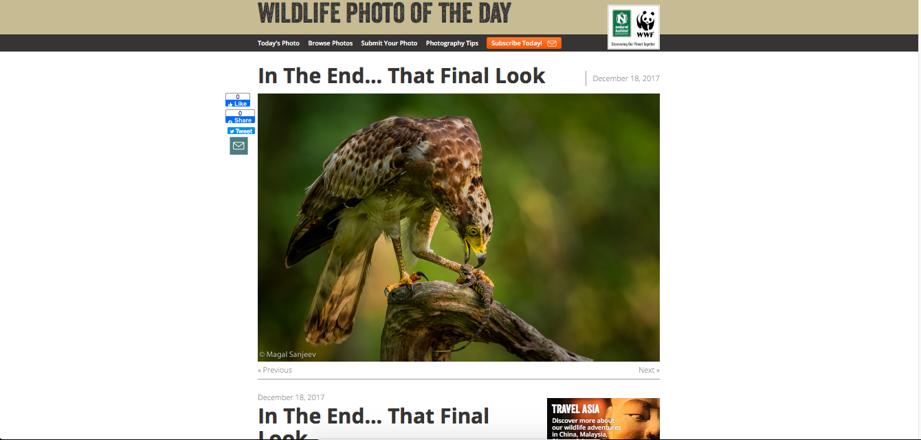 My work featured in Wildlife Photo of the day - A juvenile Serpent Eagle with its prey! Nagarhole 2016 Edition. Canon Gear.