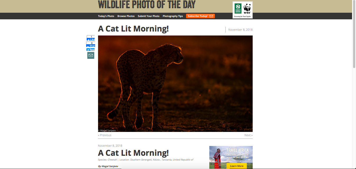 My Work featured in Wildlife Photo of the Day Magazine - that shows a rim lit cheetah on a morning. Tanzania - Serengeti 2018 Edition. Canon Gear
