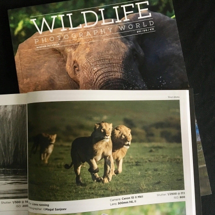 Wild Life Photography World magazine featured my "Run for the money" titled image of Lions being chased by a Lioness. Mara 2017 Edition. Canon Gear.